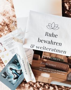 Verschenke kleine Auszeiten: Kerze, Affirmationskarte, Yoga-Mini-Poster und eine Tasche mit inspirierendem Spruch. Liebevoll verpackt, sofort geschenkfertig.